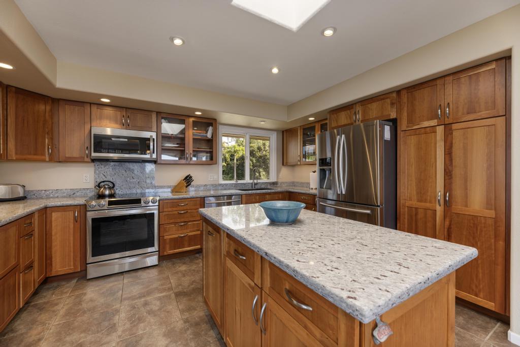 The grand open-concept floorpan, complimented with vaulted ceilings; a fabulous rock-wall fireplace; large sliding glass doors/windows/skylights offering all rooms gorgeous views + access to the fully wrap-around lanai. Bright & airy, this home has been tastefully updated with granite counters, cherry-wood cabinetry, high-end stainless appliances, “real" hardwood and ceramic tile flooring, providing warmth, comfort & functionality.