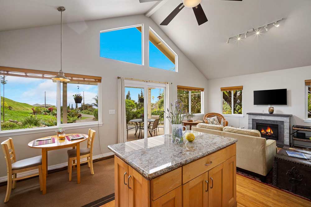 Located in a lovely neighbourhood downhill from the Kula Lodge, the home has a new roof; soaring interior vaulted ceilings creating a feeling of spaciousness; plenty of extra large windows for natural lighting; plantation blinds; granite island and kitchen counters; large pantry; upgraded new stainless appliances; cozy electric fireplace in the living room; bamboo hardwood flooring throughout; enhanced updated bathroom.
